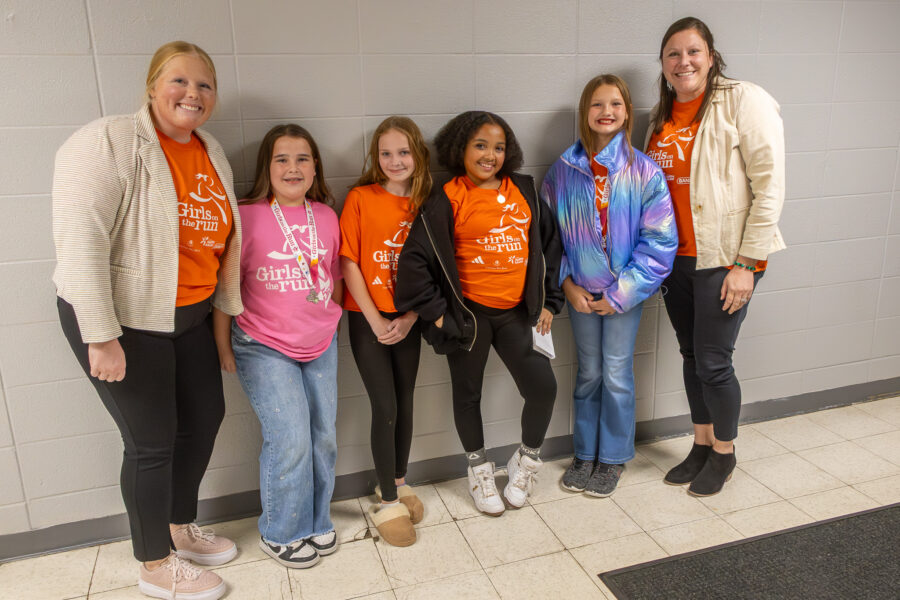 Coach Slough, Kazlyn Courtney, Alanna Dunham, Jazmina Crowder, Davina Fink, and Coach Brooke pose for a photo after the Girls on the Run presentation at the November School Board meeting. (Photo by S. Jason Cole)